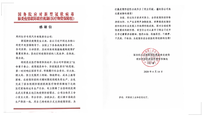 近日,中國兵器工業(yè)集團豫西集團鄭州紅宇專汽公司、一機集團和北重集團分別收到國務(wù)院應(yīng)對新型冠狀病毒肺炎疫情聯(lián)防聯(lián)控機制醫(yī)療物資保障組,包頭市青山區(qū)委、區(qū)政府發(fā)來的感謝信、慰問信,對他們在打贏疫情防控人民戰(zhàn)爭、總體戰(zhàn)、阻擊戰(zhàn)中作出的貢獻表示感謝。 豫西集團鄭州紅宇專汽公司收到國務(wù)院聯(lián)防聯(lián)控機制感謝信 4月14日,國務(wù)院應(yīng)對新型冠狀病毒肺炎疫情聯(lián)防聯(lián)控機制醫(yī)療物資保障組向中國兵器工業(yè)集團豫西集團鄭州紅宇專汽公司發(fā)來感謝信。 豫西集團鄭州紅宇專汽公司收到國務(wù)院應(yīng)對新型冠狀病毒肺炎疫情聯(lián)防聯(lián)控機制醫(yī)療物資保障組發(fā)來的感謝信 信中指出,新冠肺炎疫情發(fā)生以來,在以習(xí)近平同志為核心的黨中央堅強領(lǐng)導(dǎo)下,全國上下各條戰(zhàn)線緊急動員、各司其職、主動擔(dān)責(zé),及時采取有效措施遏制疫情擴散蔓延勢頭,堅決打好疫情防控的人民戰(zhàn)爭、總體戰(zhàn)、阻擊戰(zhàn)。 特別是在醫(yī)療物資保供戰(zhàn)中,鄭州紅宇專汽公司牢固樹立“生命重于泰山、疫情就是命令、防控就是責(zé)任”的思想,第一時間響應(yīng)國家號召,積極履行社會責(zé)任,識大體、顧大局,努力克服用工短缺、物流停運、成本上漲等困難,在疫情防控的關(guān)鍵時期連續(xù)超負荷生產(chǎn),出色完成了國務(wù)院聯(lián)防聯(lián)控機制醫(yī)療物資保障組下達的醫(yī)療廢物轉(zhuǎn)運車生產(chǎn)任務(wù),有力保障了全國特別是湖北武漢等重點地區(qū)的疫情防控需求。公司全體員工舍小家為大家、爭分奪秒、加班加點,夜以繼日奮戰(zhàn)在生產(chǎn)保供一線,用自己特有的方式支持疫情防控,為打贏疫情防控阻擊戰(zhàn)作出了突出貢獻。 鄭州紅宇專汽公司緊急生產(chǎn)醫(yī)療廢物轉(zhuǎn)運車并及時發(fā)運 疫情發(fā)生以來,鄭州紅宇專汽公司已簽約醫(yī)療廢物轉(zhuǎn)運車107臺,累計下線90臺,交付83臺。 一機集團和北重集團收到中共包頭市青山區(qū)委員會、青山區(qū)人民政府發(fā)來的感謝信和慰問信 4月13日,中共包頭市青山區(qū)委員會、青山區(qū)人民政府向中國兵器工業(yè)集團一機集團和北重集團發(fā)來感謝信和慰問信,對參與青山區(qū)防控疫情一線工作的一機集團、北重集團黨員干部職工及給予充分理解、全力支持的家屬們,表示衷心的感謝并致以最崇高的敬意!