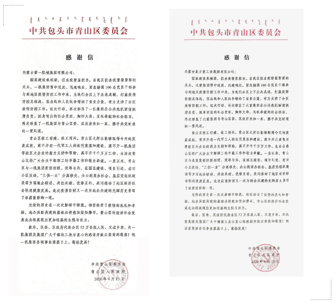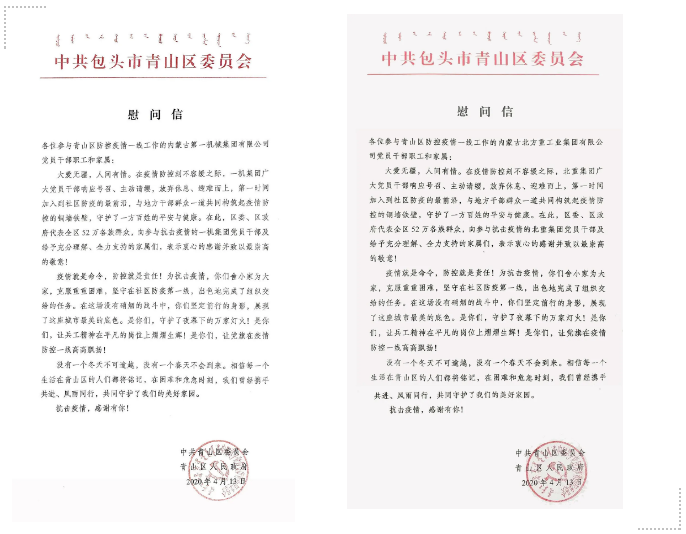 一機集團、北重集團收到中共包頭市青山區(qū)委員會、青山區(qū)人民政府發(fā)來的慰問信 信中指出,在青山區(qū)抗擊疫情最緊要的關(guān)頭,一機集團、北重集團雪中送炭、迅速響應(yīng),分別緊急抽調(diào)百余名黨員干部參與到地區(qū)疫情防控工作中,為全區(qū)上下眾志成城,打贏疫情防控的人民戰(zhàn)爭、總體戰(zhàn)、阻擊戰(zhàn)增添了寶貴力量,有力支持了全區(qū)疫情防控工作,彰顯了一機集團、北重集團在公共危機面前挺膺負責(zé)、挺身而出的社會責(zé)任,胸懷大局、無私奉獻的社會擔(dān)當(dāng)。 一機集團黨員干部馳援青山區(qū)疫情防控一線 北重集團黨員干部馳援青山區(qū)疫情防控一線 來源/豫西集團紅宇專汽公司、一機集團、北重集團