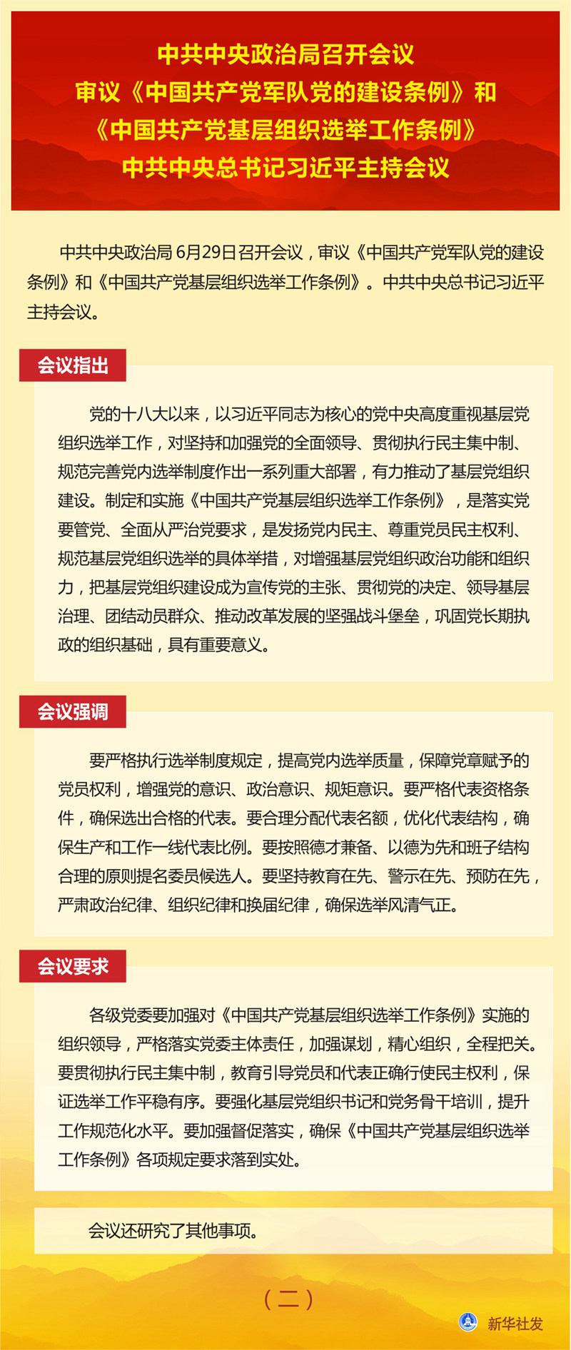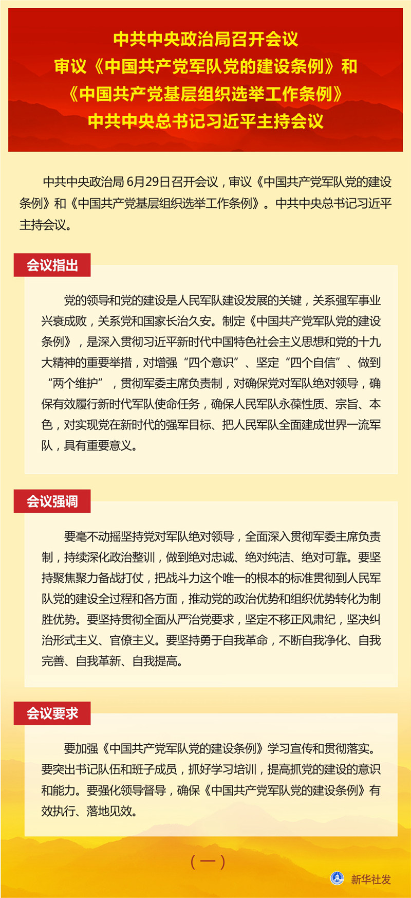 中共中央政治局召開會(huì)議 審議《中國(guó)共產(chǎn)黨軍隊(duì)黨的建設(shè)條例》和《中國(guó)共產(chǎn)黨基層組織選舉工作條例》 中共中央總書記習(xí)近平主持會(huì)議 新華社北京6月29日電 中共中央政治局6月29日召開會(huì)議,審議《中國(guó)共產(chǎn)黨軍隊(duì)黨的建設(shè)條例》和《中國(guó)共產(chǎn)黨基層組織選舉工作條例》。中共中央總書記習(xí)近平主持會(huì)議。 會(huì)議指出,黨的領(lǐng)導(dǎo)和黨的建設(shè)是人民軍隊(duì)建設(shè)發(fā)展的關(guān)鍵,關(guān)系強(qiáng)軍事業(yè)興衰成敗,關(guān)系黨和國(guó)家長(zhǎng)治久安。制定《中國(guó)共產(chǎn)黨軍隊(duì)黨的建設(shè)條例》,是深入貫徹習(xí)近平新時(shí)代中國(guó)特色社會(huì)主義思想和黨的十九大精神的重要舉措,對(duì)增強(qiáng)“四個(gè)意識(shí)”、堅(jiān)定“四個(gè)自信”、做到“兩個(gè)維護(hù)”,貫徹軍委主席負(fù)責(zé)制,對(duì)確保黨對(duì)軍隊(duì)絕對(duì)領(lǐng)導(dǎo),確保有效履行新時(shí)代軍隊(duì)使命任務(wù),確保人民軍隊(duì)永葆性質(zhì)、宗旨、本色,對(duì)實(shí)現(xiàn)黨在新時(shí)代的強(qiáng)軍目標(biāo)、把人民軍隊(duì)全面建成世界一流軍隊(duì),具有重要意義。 會(huì)議強(qiáng)調(diào),要毫不動(dòng)搖堅(jiān)持黨對(duì)軍隊(duì)絕對(duì)領(lǐng)導(dǎo),全面深入貫徹軍委主席負(fù)責(zé)制,持續(xù)深化政治整訓(xùn),做到絕對(duì)忠誠(chéng)、絕對(duì)純潔、絕對(duì)可靠。要堅(jiān)持聚焦聚力備戰(zhàn)打仗,把戰(zhàn)斗力這個(gè)唯一的根本的標(biāo)準(zhǔn)貫徹到人民軍隊(duì)黨的建設(shè)全過(guò)程和各方面,推動(dòng)黨的政治優(yōu)勢(shì)和組織優(yōu)勢(shì)轉(zhuǎn)化為制勝優(yōu)勢(shì)。要堅(jiān)持貫徹全面從嚴(yán)治黨要求,堅(jiān)定不移正風(fēng)肅紀(jì),堅(jiān)決糾治形式主義、官僚主義。要堅(jiān)持勇于自我革命,不斷自我凈化、自我完善、自我革新、自我提高。 會(huì)議要求,要加強(qiáng)《中國(guó)共產(chǎn)黨軍隊(duì)黨的建設(shè)條例》學(xué)習(xí)宣傳和貫徹落實(shí)。要突出書記隊(duì)伍和班子成員,抓好學(xué)習(xí)培訓(xùn),提高抓黨的建設(shè)的意識(shí)和能力。要強(qiáng)化領(lǐng)導(dǎo)督導(dǎo),確?!吨袊?guó)共產(chǎn)黨軍隊(duì)黨的建設(shè)條例》有效執(zhí)行、落地見(jiàn)效。 會(huì)議指出,黨的十八大以來(lái),以習(xí)近平同志為核心的黨中央高度重視基層黨組織選舉工作,對(duì)堅(jiān)持和加強(qiáng)黨的全面領(lǐng)導(dǎo)、貫徹執(zhí)行民主集中制、規(guī)范完善黨內(nèi)選舉制度作出一系列重大部署,有力推動(dòng)了基層黨組織建設(shè)。制定和實(shí)施《中國(guó)共產(chǎn)黨基層組織選舉工作條例》,是落實(shí)黨要管黨、全面從嚴(yán)治黨要求,是發(fā)揚(yáng)黨內(nèi)民主、尊重黨員民主權(quán)利、規(guī)范基層黨組織選舉的具體舉措,對(duì)增強(qiáng)基層黨組織政治功能和組織力,把基層黨組織建設(shè)成為宣傳黨的主張、貫徹黨的決定、領(lǐng)導(dǎo)基層治理、團(tuán)結(jié)動(dòng)員群眾、推動(dòng)改革發(fā)展的堅(jiān)強(qiáng)戰(zhàn)斗堡壘,鞏固黨長(zhǎng)期執(zhí)政的組織基礎(chǔ),具有重要意義。 會(huì)議強(qiáng)調(diào),要嚴(yán)格執(zhí)行選舉制度規(guī)定,提高黨內(nèi)選舉質(zhì)量,保障黨章賦予的黨員權(quán)利,增強(qiáng)黨的意識(shí)、政治意識(shí)、規(guī)矩意識(shí)。要嚴(yán)格代表資格條件,確保選出合格的代表。要合理分配代表名額,優(yōu)化代表結(jié)構(gòu),確保生產(chǎn)和工作一線代表比例。要按照德才兼?zhèn)?、以德為先和班子結(jié)構(gòu)合理的原則提名委員候選人。要堅(jiān)持教育在先、警示在先、預(yù)防在先,嚴(yán)肅政治紀(jì)律、組織紀(jì)律和換屆紀(jì)律,確保選舉風(fēng)清氣正。 會(huì)議要求,各級(jí)黨委要加強(qiáng)對(duì)《中國(guó)共產(chǎn)黨基層組織選舉工作條例》實(shí)施的組織領(lǐng)導(dǎo),嚴(yán)格落實(shí)黨委主體責(zé)任,加強(qiáng)謀劃,精心組織,全程把關(guān)。要貫徹執(zhí)行民主集中制,教育引導(dǎo)黨員和代表正確行使民主權(quán)利,保證選舉工作平穩(wěn)有序。要強(qiáng)化基層黨組織書記和黨務(wù)骨干培訓(xùn),提升工作規(guī)范化水平。要加強(qiáng)督促落實(shí),確保《中國(guó)共產(chǎn)黨基層組織選舉工作條例》各項(xiàng)規(guī)定要求落到實(shí)處。 會(huì)議還研究了其他事項(xiàng)。 |