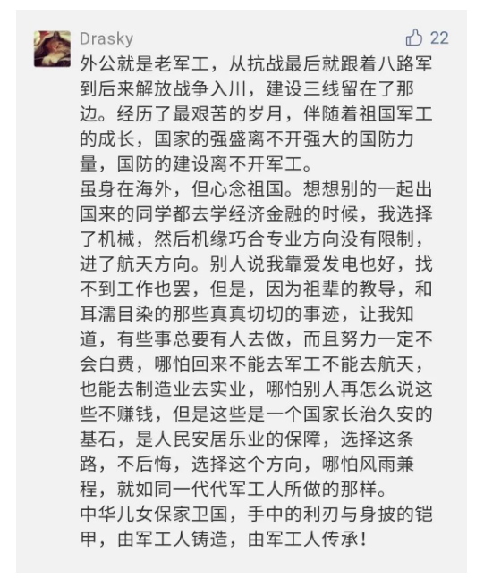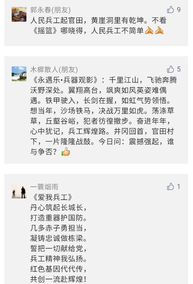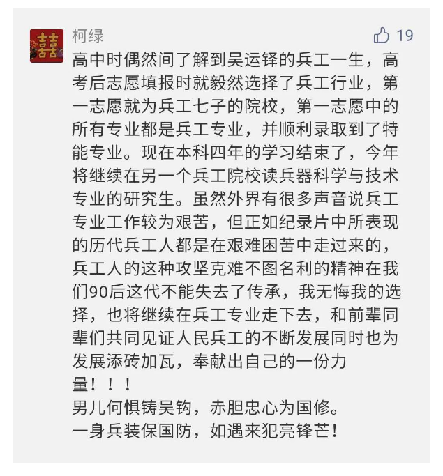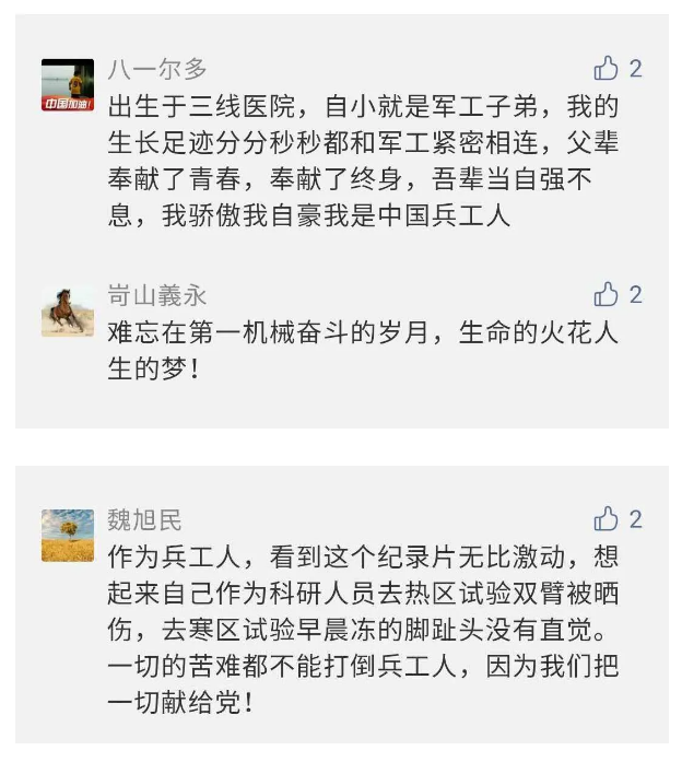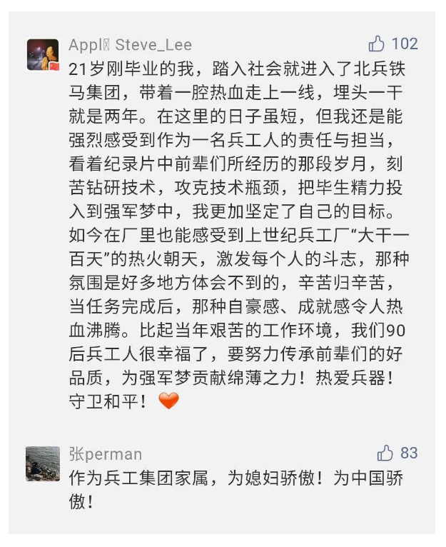 在中國(guó)共產(chǎn)黨成立九十九周年之際,由中國(guó)兵器工業(yè)集團(tuán)有限公司組織攝制、反映人民兵工在黨的領(lǐng)導(dǎo)下80余年光輝奮斗歷程、廣大兵工人弘揚(yáng)“把一切獻(xiàn)給黨”人民兵工精神的三集紀(jì)錄片《人民兵工》自7月1日-3日每晚20點(diǎn)在中央廣播電視總臺(tái)中文國(guó)際頻道(CCTV-4)《國(guó)家記憶》首播以來(lái),在兵器系統(tǒng)和觀眾中引發(fā)強(qiáng)烈反響,很多網(wǎng)友、觀眾紛紛留言表達(dá)了自己的觀后感受。 觀眾在兵器工業(yè)集團(tuán)官微的留言區(qū)直抒了觀影感受,有的熱淚盈眶,有的心潮起伏,有的興起賦詩(shī),有的認(rèn)為讓心靈得到凈化、思想得以提升,有的認(rèn)為是最直觀的國(guó)防教育教材......