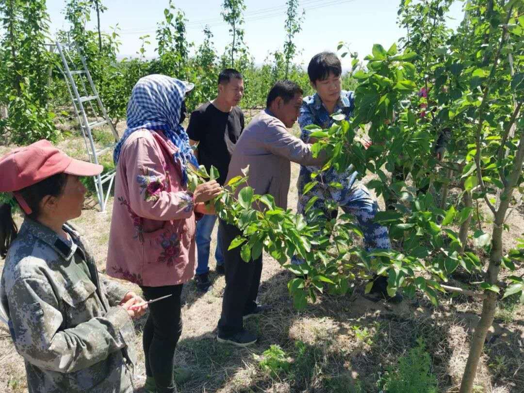 王躍(右一)指導(dǎo)村集體經(jīng)濟(jì)果園工人稀果