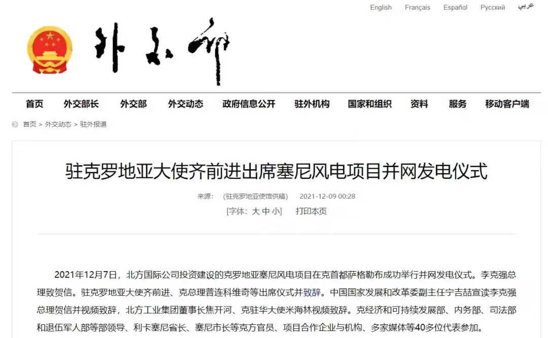 2021年12月7日,中國兵器工業(yè)集團(tuán)有限公司北方公司所屬北方國際投資、建設(shè)和運營的塞尼156MW風(fēng)電項目在克羅地亞首都薩格勒布隆重舉行并網(wǎng)發(fā)電儀式。李克強(qiáng)總理致賀信??肆_地亞總理安德烈·普連科維奇,中國駐克羅地亞大使齊前進(jìn)出席儀式并致辭。中國國家發(fā)展和改革委員會副主任寧吉喆宣讀李克強(qiáng)總理賀信并視頻致辭,中國兵器工業(yè)集團(tuán)有限公司董事長焦開河、克駐華大使米海林視頻致辭。 中華人民共和國外交部報道 普連科維奇總理在致辭中表示,感謝李克強(qiáng)總理發(fā)來賀信,他與中國領(lǐng)導(dǎo)人一直非常重視塞尼風(fēng)電項目投資與建設(shè)。祝賀項目克服疫情與地震等影響,成功并網(wǎng)發(fā)電。增加清潔可再生能源、綠色電力對克乃至歐洲都很重要,克政府的重要戰(zhàn)略和目標(biāo)之一就是低碳發(fā)展和增加清潔能源供應(yīng)。塞尼風(fēng)電項目占克總發(fā)電量將達(dá)3.5%,對克實現(xiàn)2022年可再生能源比例30%目標(biāo)具有很大幫助。此次投資使北方國際成為在克最大的清潔能源投資企業(yè)。非常歡迎更多中國企業(yè)擴(kuò)大對克投資。 寧吉喆宣讀李克強(qiáng)總理賀信并視頻致辭時表示,2017年11月第六次中國—中東歐國家領(lǐng)導(dǎo)人會晤期間,在李克強(qiáng)總理和普連科維奇總理等中東歐16國領(lǐng)導(dǎo)人的共同見證下,塞尼項目簽署了協(xié)議。項目既是中國堅定踐行綠色發(fā)展理念的具體體現(xiàn),也是中國深化與克羅地亞、與中東歐國家務(wù)實合作的生動實踐。希望中克兩國政府部門,企業(yè)等有關(guān)各方共同努力、相互配合,運營好塞尼項目,打造出中歐綠色合作的樣板,帶動兩國務(wù)實合作持續(xù)深入發(fā)展,造福兩國人民。 焦開河在致辭時表示,在塞尼項目投入運營之際,李克強(qiáng)總理專門致信祝賀。作為塞尼項目的投資方、建設(shè)方、運營方,我們備受鼓舞,深感自豪!未來,中國兵器工業(yè)集團(tuán)有限公司將繼續(xù)深入貫徹落實習(xí)近平總書記重要指示批示精神和李克強(qiáng)總理賀信重要要求,以高標(biāo)準(zhǔn)、可持續(xù)、惠民生為目標(biāo),與克方合作伙伴坦誠溝通、攜手并進(jìn),進(jìn)一步推動綠色能源建設(shè),努力打造更多的“一帶一路”標(biāo)志性、引領(lǐng)性、示范性項目,為鞏固中克戰(zhàn)略合作伙伴關(guān)系、推進(jìn)中克從經(jīng)貿(mào)領(lǐng)域到全方位合作貢獻(xiàn)積極力量。 齊前進(jìn)祝賀塞尼風(fēng)電項目順利完工和成功并網(wǎng)發(fā)電。他表示,塞尼風(fēng)電站項目并網(wǎng)發(fā)電是中克兩國領(lǐng)導(dǎo)人親自關(guān)注和推動的成果。作為迄今最大的中國在克投資合作項目,塞尼風(fēng)電項目是中克和中歐綠色合作的典范,對克提高清潔能源生產(chǎn)消費發(fā)揮著重要作用。項目建設(shè)過程中為當(dāng)?shù)嘏囵B(yǎng)了許多工程、技術(shù)和管理人才,帶動了當(dāng)?shù)仄髽I(yè)發(fā)展,增加了就業(yè)和稅收,促進(jìn)了當(dāng)?shù)亟?jīng)濟(jì)社會發(fā)展,充分體現(xiàn)了中國對外經(jīng)貿(mào)合作與“一帶一路”倡議秉持的互利共贏、共同發(fā)展的理念,也是中國積極倡導(dǎo)的綠色低碳發(fā)展合作的典范。 塞尼項目位于克羅地亞中部亞得利亞海沿岸,建設(shè)總投資1.79億歐元,總裝機(jī)容量156MW,采用39臺4MW風(fēng)力發(fā)電機(jī)組設(shè)備,風(fēng)場面積達(dá)42.8平方公里。項目正式運營后,預(yù)計每年平均發(fā)電超3000小時,貢獻(xiàn)約5.3億度綠色電力,可減少二氧化碳排放約46萬噸,將為克羅地亞促進(jìn)能源轉(zhuǎn)型、發(fā)展綠色經(jīng)濟(jì)提供強(qiáng)勁助力,貢獻(xiàn)了“中國智慧”“中國方案”。 來源/中華人民共和國外交部、綜合有關(guān)報道 |