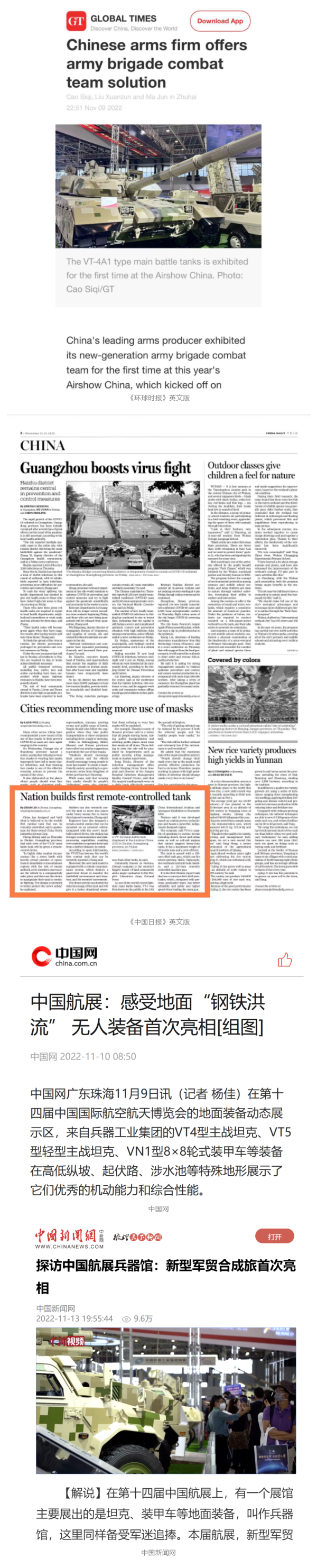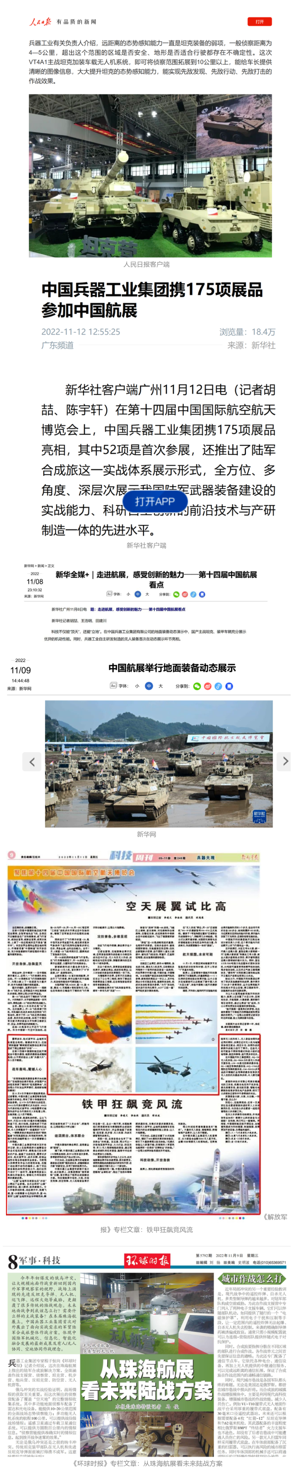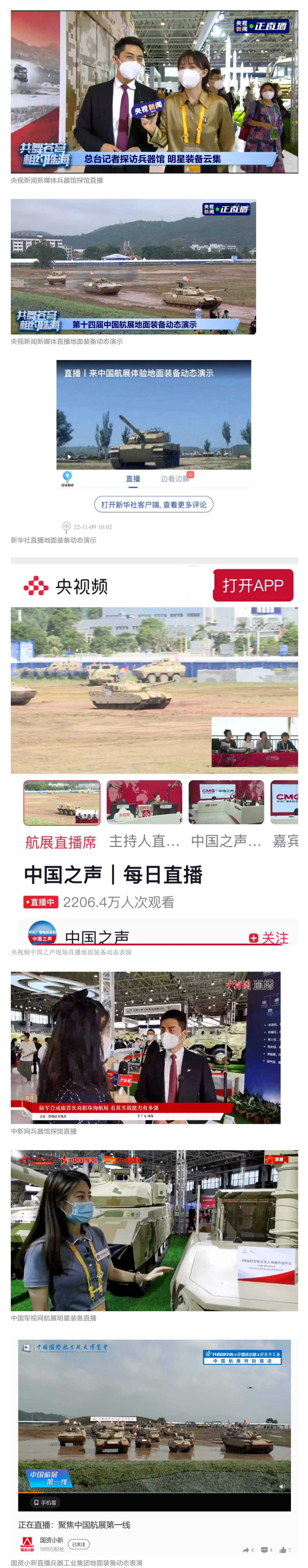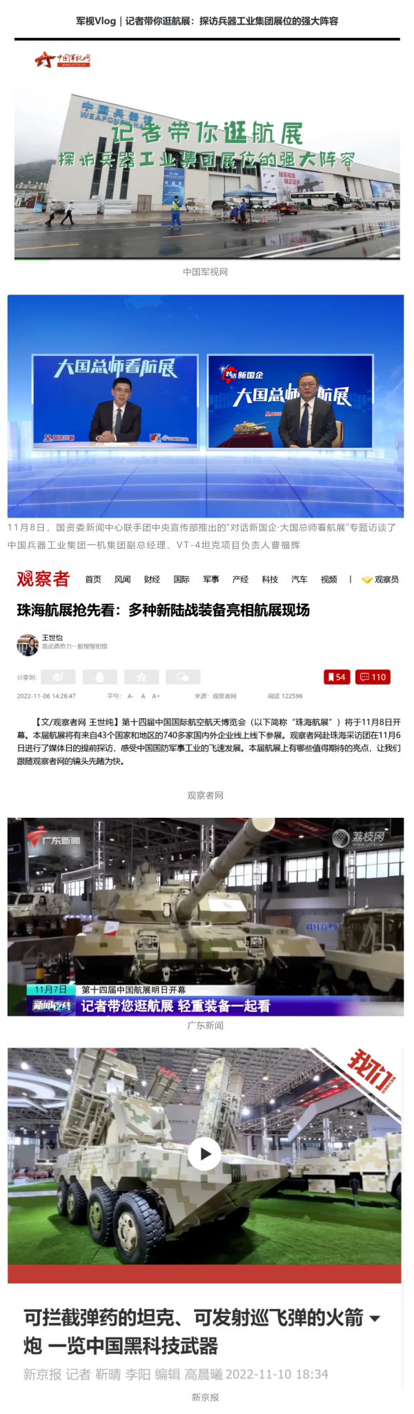 央視國防軍事頻道航展特別報(bào)道《炫舞天地間》11月12日《賞“鐵甲雄風(fēng)”!看航展地面裝備“鋼鐵洪流”名場面》對兵器工業(yè)集團(tuán)武器裝備特色亮點(diǎn)進(jìn)行報(bào)道?!秶儡娛略鐖?bào)》11月7日推出報(bào)道《第十四屆中國國際航空航天博覽會明天開幕 中國兵器館首次以陸軍合成旅實(shí)戰(zhàn)體系形式展出》,對兵器館陸軍合成旅實(shí)戰(zhàn)體系進(jìn)行報(bào)道?!盾娛聢?bào)道》11月9日推出《第十四屆中國國際航空航天博覽會 地面兵器裝備首次聯(lián)合陸航直升機(jī)進(jìn)行動態(tài)展示》報(bào)道?!盾娒孕刑煜隆?1月9日推出報(bào)道《軍迷打卡航展2022》以專業(yè)軍迷視角探館兵器館,全面展示兵器工業(yè)集團(tuán)參展裝備特色亮點(diǎn)。