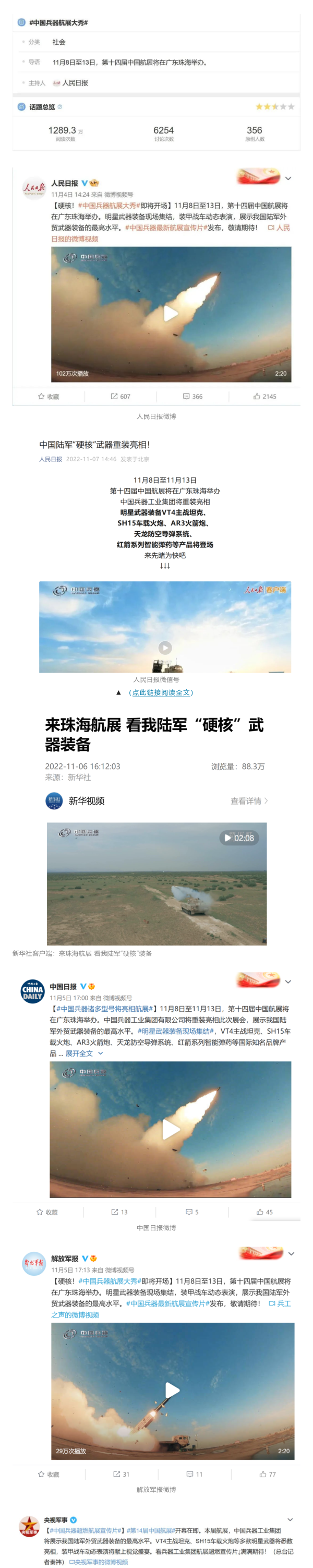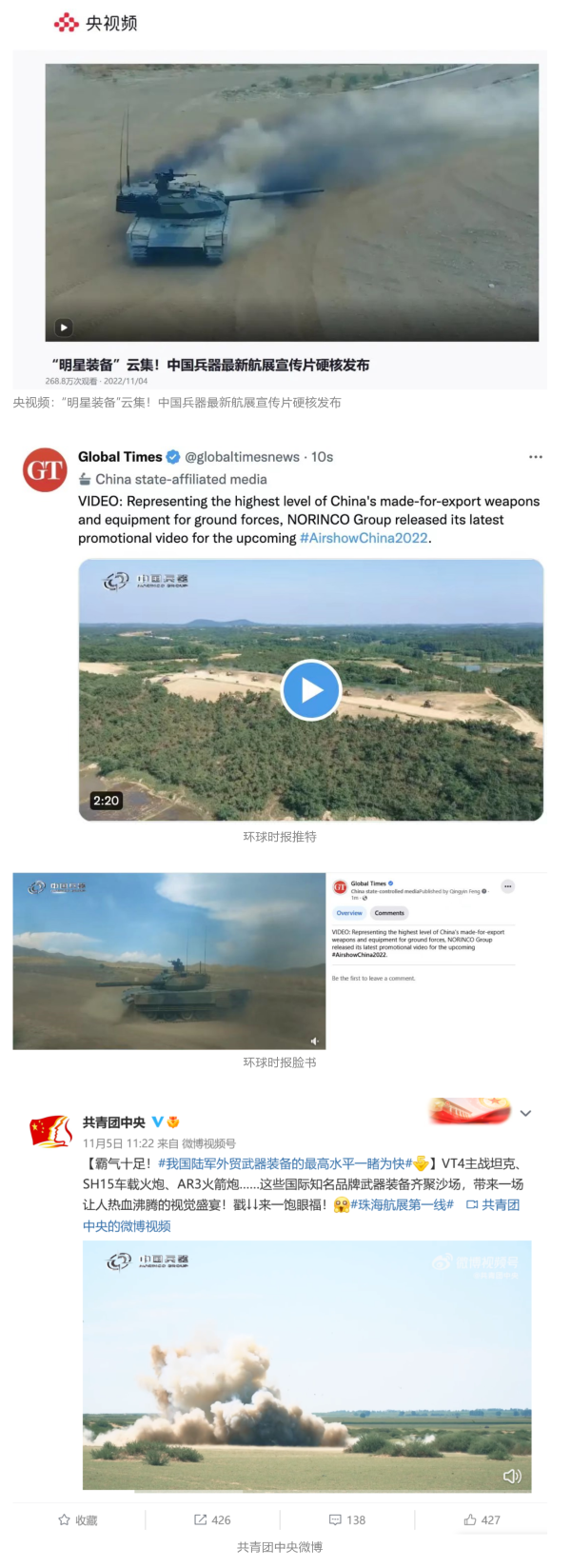 人民日報(bào)官方微博、微信公眾號,新華社客戶端、央視新聞客戶端、中國日報(bào)微博、參考消息微信公眾號、解放軍報(bào)微博、央視軍事微博、CGTN微博、中國軍號微博、共青團(tuán)中央微博、環(huán)球時(shí)報(bào)(英文網(wǎng)站、臉書賬號、推特賬號)、嗶哩嗶哩、學(xué)習(xí)強(qiáng)國平臺、國資小新視頻號、網(wǎng)易軍事、騰訊軍事、鳳凰軍事、北京日報(bào)、東方衛(wèi)視看看新聞全媒體、北京電視臺等20余家中央主流媒體、國家部委、省市媒體的新媒體第一時(shí)間播發(fā)集團(tuán)公司航展宣傳片等視頻作品燃爆全網(wǎng),累計(jì)閱讀量突破1700萬人次。集團(tuán)公司微信公眾號、微博、抖音號、快手號、微信視頻號、知乎號等新媒體宣傳片播放閱讀量超過800萬人次,點(diǎn)贊超過30萬人次。集團(tuán)公司微信公眾號推出《硬核!中國兵器最新航展宣傳片發(fā)布》《中國兵器航展節(jié)目單,請選出心中明星裝備》《航展首日,中國兵器閃耀亮相!》等7篇報(bào)道,閱讀量超過25萬人次,集團(tuán)公司微信視頻號、抖音號、快手號等新媒體賬號發(fā)布“中國兵器航展大秀”系列視頻,觀看量超過330萬人次。