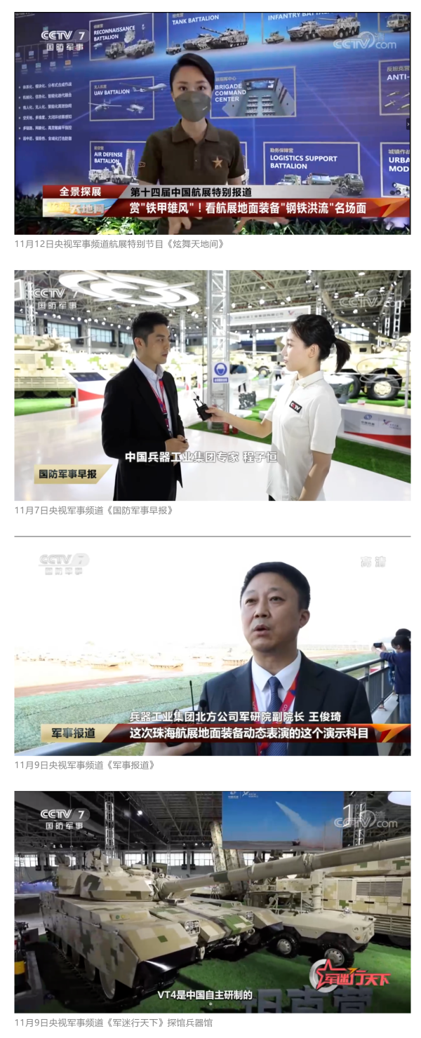 11月6日、7日、9日,央視《新聞聯(lián)播》三次報(bào)道兵器工業(yè)集團(tuán)參展情況,重點(diǎn)介紹了集團(tuán)公司總體參展情況、地面裝備動態(tài)演示全新編排、國產(chǎn)輪式反伏擊車首次采用有人駕駛和無人駕駛混合編隊(duì)等內(nèi)容。11月8日,央視新聞?lì)l道直播地面裝備動態(tài)演示;11月12日,央視新聞?lì)l道航展特別報(bào)道《藍(lán)天盛會》探訪兵器館,采訪兵器工業(yè)集團(tuán)嘉賓對陸軍合成旅作了報(bào)道。