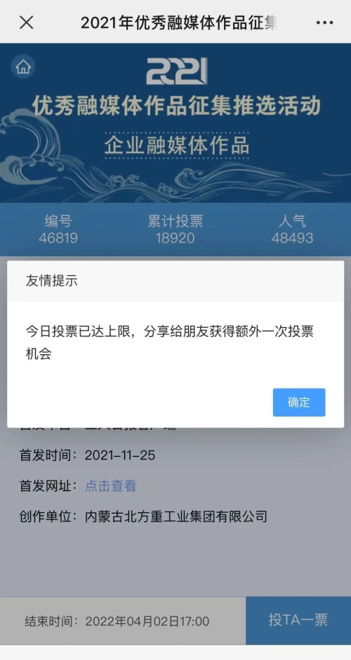 近日,由“文化強國”光明日報協(xié)同推廣平臺、光明網、北京師范大學新媒體傳播研究中心和光明天翼5G融媒實驗室共同主辦的“2021年優(yōu)秀融媒體作品征集推選活動”開啟線上投票環(huán)節(jié),經過專家委員會評審,中國兵器工業(yè)集團北重集團《白楊伴我獻國防》音樂MV入選活動前二十名,并進入網絡投票環(huán)節(jié)。 《白楊伴我獻國防》 楊樹參天 高聳云端的是兵工人 “履行好強軍首責”的壯志凌云! 深植北疆 傾獻沃土的是北重人 “推動高質量發(fā)展”的壯志豪情! 白楊樹伴著我們茁壯成長 見證著我們獻身國防! 投票方式 1.掃描下方二維碼,進入初始界面,點擊“企業(yè)融媒體作品征集”,進入投票界面點擊《白楊伴我獻國防》,點擊“投TA一票”; 2. 每人每日可投10票,直至提示投票達到上限即可; 3.投票時間:2022年3月17日09:00-2022年4月2日17:00。 來源/光明網、北重集團 |