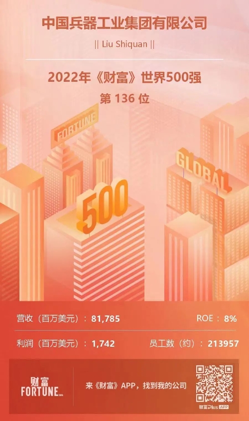 8月3日,《財富》世界500強排行榜正式發(fā)布,中國兵器工業(yè)集團(tuán)有限公司以817.85億美元的營業(yè)收入排名第136位,連續(xù)第13年入榜。