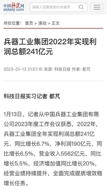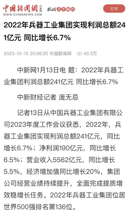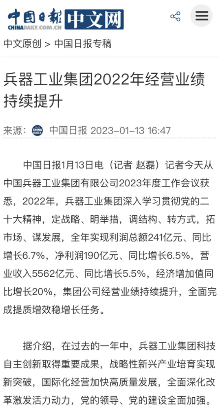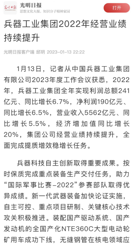 1月13日,中國(guó)兵器工業(yè)集團(tuán)有限公司召開2023年度工作會(huì)議,傳達(dá)學(xué)習(xí)中央領(lǐng)導(dǎo)同志、軍方首長(zhǎng)和上級(jí)部門重要批示,總結(jié)集團(tuán)公司2022年工作,研究部署2023年主要工作任務(wù)。 集團(tuán)公司2022年重點(diǎn)工作取得的成績(jī)及下一步的改革發(fā)展受到社會(huì)媒體廣泛關(guān)注。新華社、新華財(cái)經(jīng)、人民網(wǎng)、經(jīng)濟(jì)日?qǐng)?bào)客戶端、光明日?qǐng)?bào)客戶端、中國(guó)日?qǐng)?bào)網(wǎng)、中國(guó)科技網(wǎng)、中國(guó)新聞網(wǎng)、央廣網(wǎng)、國(guó)資委網(wǎng)站、學(xué)習(xí)強(qiáng)國(guó)中央企業(yè)學(xué)習(xí)平臺(tái)、新浪網(wǎng)、騰訊網(wǎng)、搜狐網(wǎng)、網(wǎng)易網(wǎng)、今日頭條等中央主流媒體、國(guó)家部委網(wǎng)站及知名網(wǎng)絡(luò)媒體對(duì)集團(tuán)公司工作會(huì)議進(jìn)行了報(bào)道,重點(diǎn)關(guān)注集團(tuán)公司高質(zhì)量發(fā)展、科技創(chuàng)新、戰(zhàn)略性新興產(chǎn)業(yè)培育、深化改革、國(guó)際化經(jīng)營(yíng)、履行央企社會(huì)責(zé)任等內(nèi)容。其中新華社以《北斗時(shí)空智能服務(wù)平臺(tái)累計(jì)服務(wù)終端數(shù)突破15億》為題,重點(diǎn)報(bào)道了集團(tuán)公司2022年在自主創(chuàng)新、戰(zhàn)略新興產(chǎn)業(yè)培育、專利申請(qǐng)等方面取得的成績(jī);經(jīng)濟(jì)日?qǐng)?bào)客戶端、光明日?qǐng)?bào)客戶端、中國(guó)日?qǐng)?bào)網(wǎng)等以《兵器工業(yè)集團(tuán)2022年經(jīng)營(yíng)業(yè)績(jī)持續(xù)提升》為題,重點(diǎn)報(bào)道了集團(tuán)公司在高質(zhì)量發(fā)展、全面完成提質(zhì)增效穩(wěn)增長(zhǎng)方面取得的成績(jī)。集團(tuán)公司門戶網(wǎng)站、微信公眾號(hào)、微博等新媒體也對(duì)集團(tuán)公司工作會(huì)議進(jìn)行了及時(shí)報(bào)道,各成員單位紛紛對(duì)相關(guān)內(nèi)容進(jìn)行轉(zhuǎn)載,引發(fā)全系統(tǒng)關(guān)注。 新華社:北斗時(shí)空智能服務(wù)平臺(tái)累計(jì)服務(wù)終端數(shù)突破15億 新華財(cái)經(jīng):兵器工業(yè)集團(tuán)2022年實(shí)現(xiàn)凈利潤(rùn)190億元 同比增長(zhǎng)6.5% 人民網(wǎng):2022年中央企業(yè)營(yíng)收同比增長(zhǎng)8.3% 科技創(chuàng)新成效顯著 經(jīng)濟(jì)日?qǐng)?bào)客戶端:兵器工業(yè)集團(tuán)2022年經(jīng)營(yíng)業(yè)績(jī)持續(xù)提升 光明日?qǐng)?bào)客戶端:兵器工業(yè)集團(tuán)2022年經(jīng)營(yíng)業(yè)績(jī)持續(xù)提升 中國(guó)日?qǐng)?bào)網(wǎng):兵器工業(yè)集團(tuán)2022年經(jīng)營(yíng)業(yè)績(jī)持續(xù)提升 中國(guó)科技網(wǎng):兵器工業(yè)集團(tuán)2022年實(shí)現(xiàn)利潤(rùn)總額241億元 中國(guó)新聞網(wǎng):2022年兵器工業(yè)集團(tuán)實(shí)現(xiàn)利潤(rùn)總額241億元 同比增長(zhǎng)6.7% 國(guó)資委網(wǎng)站:2022年兵器工業(yè)集團(tuán)實(shí)現(xiàn)利潤(rùn)總額241億元 同比增長(zhǎng)6.7% 學(xué)習(xí)強(qiáng)國(guó)中央企業(yè)學(xué)習(xí)平臺(tái):兵器工業(yè)集團(tuán)2022年經(jīng)營(yíng)業(yè)績(jī)持續(xù)提升 集團(tuán)公司職工及廣大網(wǎng)友熱議工作會(huì)議 “這次會(huì)議全面總結(jié)了2022年工作,深入分析研判當(dāng)前形勢(shì),部署2023年重點(diǎn)工作,為我們做好2023年及今后一個(gè)時(shí)期的工作明確了目標(biāo)、堅(jiān)定了信心?!?/p> “作為兵工人,我要苦練內(nèi)功、不懼挑戰(zhàn)、奮勇向前,為建設(shè)具有全球競(jìng)爭(zhēng)力的世界一流集團(tuán)公司貢獻(xiàn)自己的力量?!?/p> “聚焦高科技領(lǐng)域,制造更多的大國(guó)重器,讓更多的產(chǎn)品服務(wù)老百姓?!?/p> “在不平凡的2022年取得了亮眼的工作成績(jī),為兵器工業(yè)點(diǎn)贊?!?/p> “希望能有更多新型武器裝備部隊(duì),2023年,望你們?cè)賱?chuàng)輝煌,加油!” |