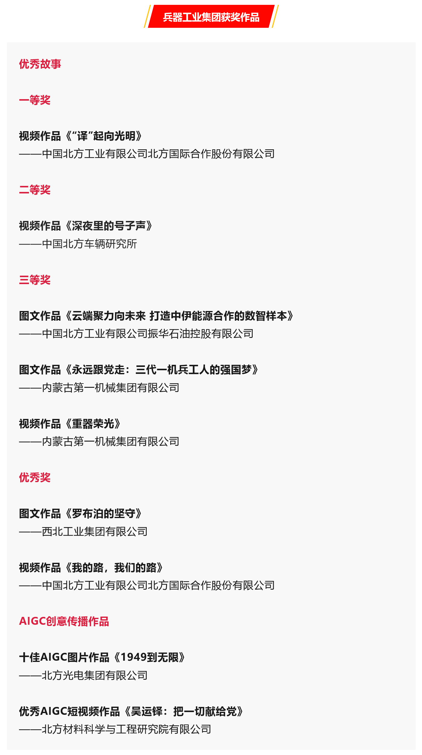 12月3日,由國(guó)務(wù)院國(guó)資委宣傳局、人民網(wǎng)聯(lián)合主辦的“砥礪七十五載 譜寫央企擔(dān)當(dāng)”第七屆中央企業(yè)優(yōu)秀故事暨AIGC創(chuàng)意傳播作品發(fā)布展示活動(dòng)在京舉行,中國(guó)兵器工業(yè)集團(tuán)有限公司共有9件作品獲獎(jiǎng),其中,優(yōu)秀故事一等獎(jiǎng)1項(xiàng)、二等獎(jiǎng)1項(xiàng)、三等獎(jiǎng)3項(xiàng)、優(yōu)秀獎(jiǎng)2項(xiàng),十佳AIGC圖片作品1項(xiàng)、優(yōu)秀AIGC短視頻作品1項(xiàng)。