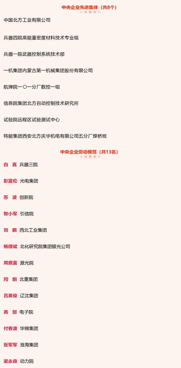 兵器工業(yè)集團(tuán)8個集體和13名個人獲中央企業(yè)先進(jìn)集體和勞動模范表彰 |